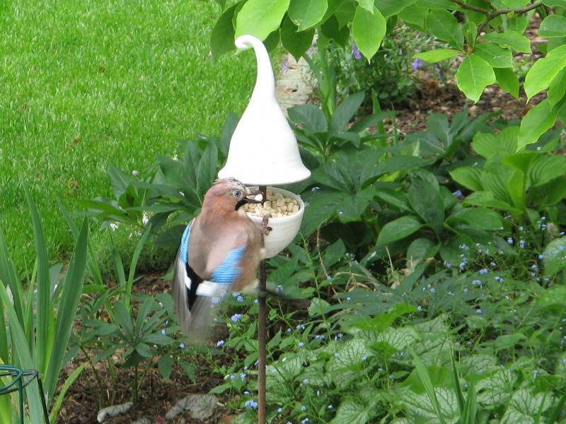 Herr Buntspecht steht ja mehr auf den "Haferflocken in Öl - Rosinen - Sonnenblumenkeren"-Mix, leider habe ich Frau Specht nicht mehr fotografieren können, wie sie sich ihre Nuss angelte - hier also statt dessen ein altes Foto mit Eichelhäher, um die Technik zu demonstrieren (die Spechtfrau brauchte dabei allerdings nicht so hektisch mit den Flügeln zu schlagen ;D)