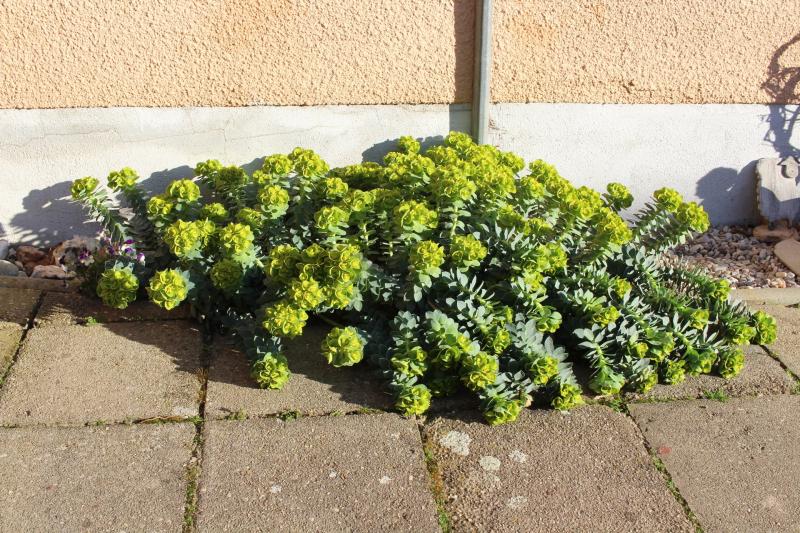 Ein Spaltenbewohner - könnte das eine Hybride zwischen Euphorbia amygdaloides var. robbiae und characias sein? Keine Ahnung wie die dort keimen konnte, das ist eine dichte Reihe von Palisadensteinen als Hochbeeteinfassung. Im Hintergrund einer der mittlerweile 6 oder 7 großen characias, ursprünglich mal als Black Pearl gekauft, säen sie sich selber aus (trotz mittlerweile recht konsequentem Abschneiden der Fruchtstände).