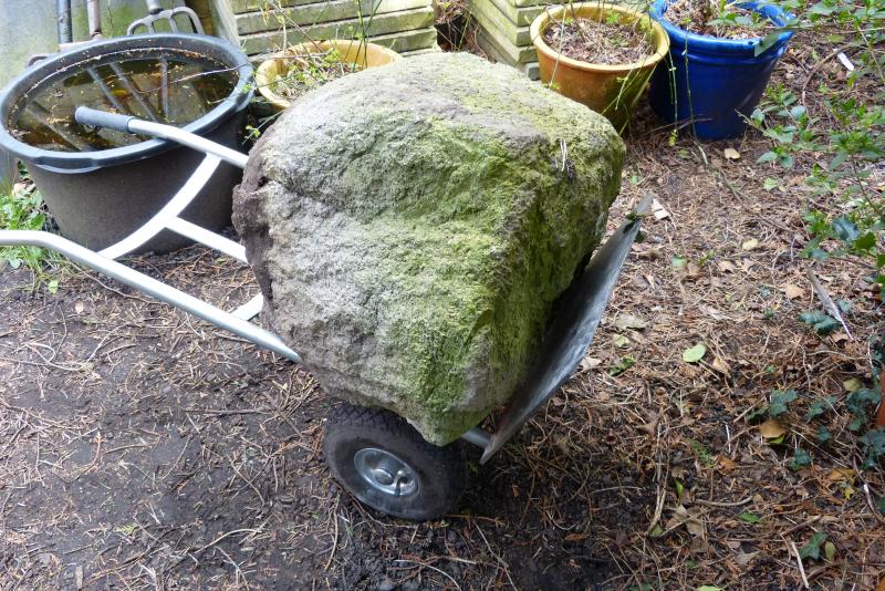 Dieser Stein (Maximalmaße 75x60x40cm) mußte Platz machen für eine Maibeere und erhielt eine andere Lagerstätte. Mit einer guten Sackkarre ist der Transport kein Problem.