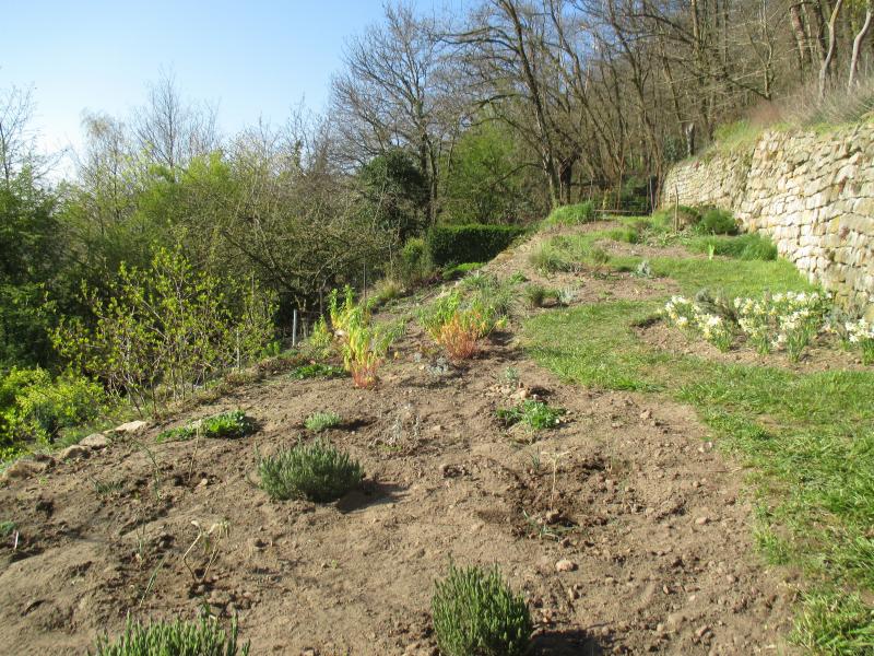 Dort wo die Bank stehen soll, habe ich niedrige Pflanzen gesetzt, damit die Aussicht frei bleibt.