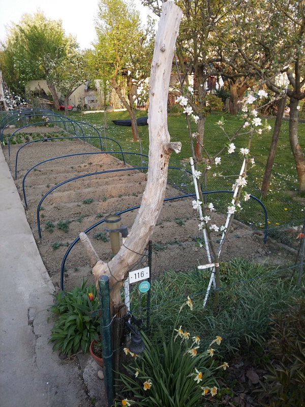 Ich habe statt Rosenbogen am Eingang Totholz stehen, nachdem der letzte Stamm nach gut 10 Jahren durchgefault war, habe ich im Herbst einen neuen aufgestellt.