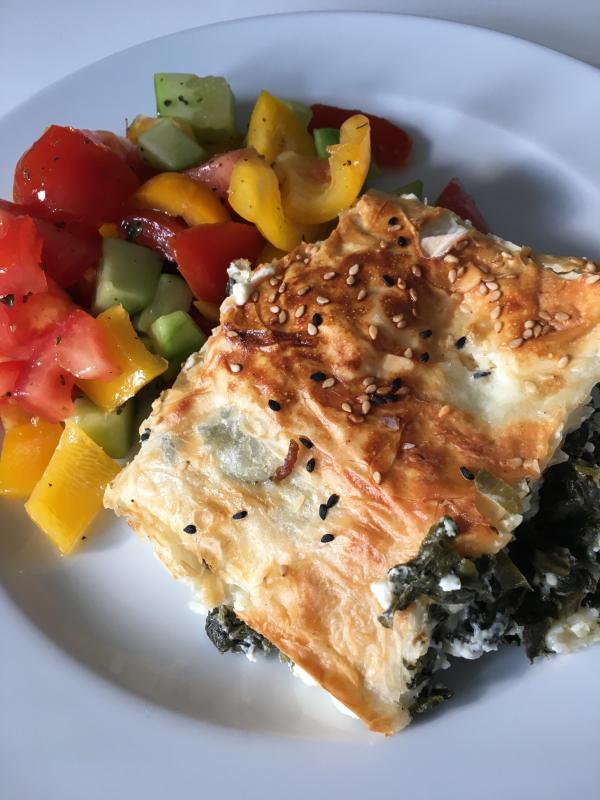 Ich hatte noch Yufkateig und Neuseeländerspinat im Froster. Es gab also Börek mit Spinat, Schafskäse und Bärlauch gefüllt. Dazu Salat aus Tomaten, Gurken und Paprika.