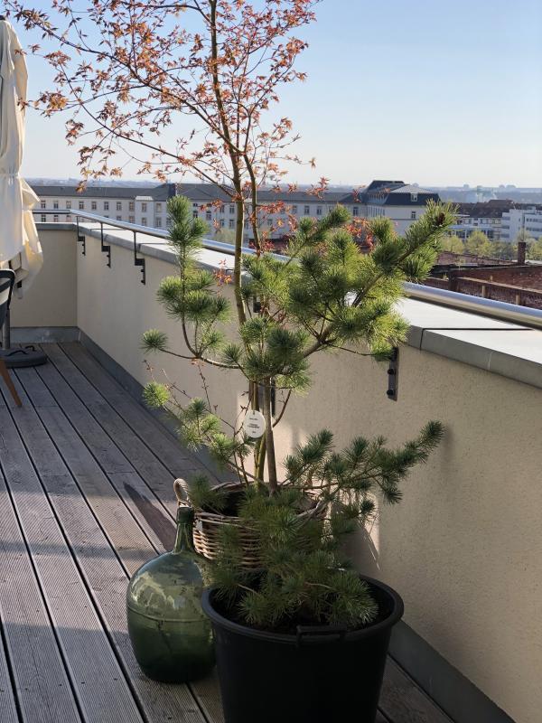 Es sind mittlerweile statt der geplanten drei Kübel insgesamt 16 geworden :o und ich konnte viel Erfahrung sammeln. Die beiden japanischen Mädchenkiefern entwickeln sich großartig und sind sehr pflegeleicht. Der Ahorn ist auch hervorragend gewachsen (ca. 4 m) und hat einen wunderschönen Wuchs.