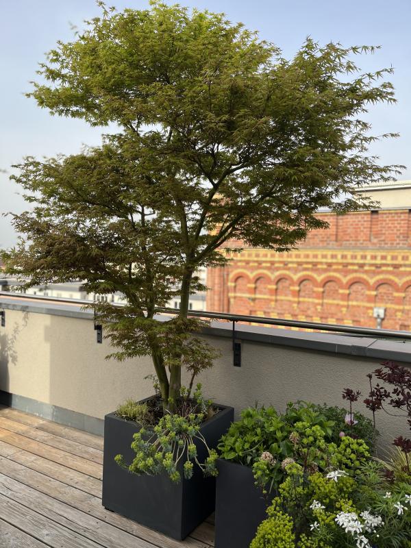 Der Ahorn muss jetzt regelmäßig geschnitten werden, da er für den Kübel (60x60) schon zu groß geworden ist und bei Wind ggf. umkippen könnte.