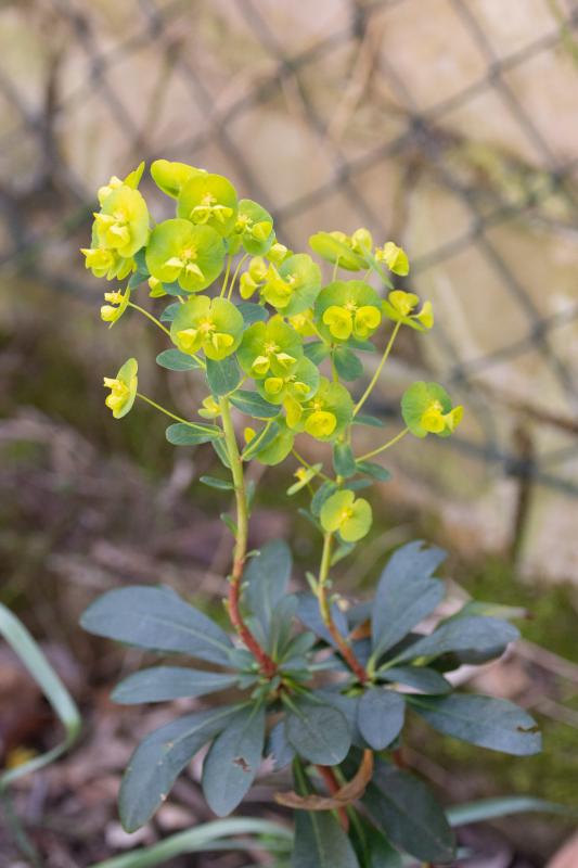 Ein Spaltenbewohner - könnte das eine Hybride zwischen Euphorbia amygdaloides var. robbiae und characias sein? Keine Ahnung wie die dort keimen konnte, das ist eine dichte Reihe von Palisadensteinen als Hochbeeteinfassung. Im Hintergrund einer der mittlerweile 6 oder 7 großen characias, ursprünglich mal als Black Pearl gekauft, säen sie sich selber aus (trotz mittlerweile recht konsequentem Abschneiden der Fruchtstände).