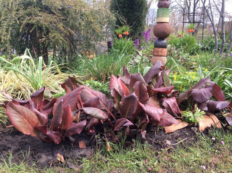 Auch unsere Bergenien haben durch den Spätfrost sehr gelitten. Eine Ausnahme ist die Namenlose. Sie wird auch bald blühen. Ich habe drei Ableger in Töpfe gesetzt. Ich muss noch einmal nachlesen, wer die Besteller waren. Ein schnelles Foto mit dem IPad. Es ist richtig kalt draußen. Es weht ein eisiger Wind.