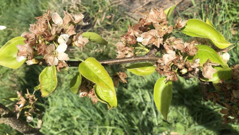 Hier hat der Luftfrost wie erwartet zerstört, was noch nicht kaputt war. 100% Schaden gab es bereits bei Pfirsichen, Mandeln, Aprikosen, Nashis. Äpfel sind jetzt auch wie erwartet vernichtet, es hat sie in der Vollblüte erwischt, es gibt aber spätblühende Sorten die es noch schaffen können - wenn nicht nächste Woche die dritte Frostkeule übers Land zieht. Da möchte noch mal ausdrücklich den roten Berlepsch und die Orleans Renette empfehlen. An den Kiwis ist jetzt der dritte Austrieb abgefroren. Mal sehen, ob die überhaupt überleben. Die Feigen standen im Saft, alles abgefroren trotz Schutz, am Boden hatte es -6°C. Ein junger Pfirsich ist auch ganz tot.
