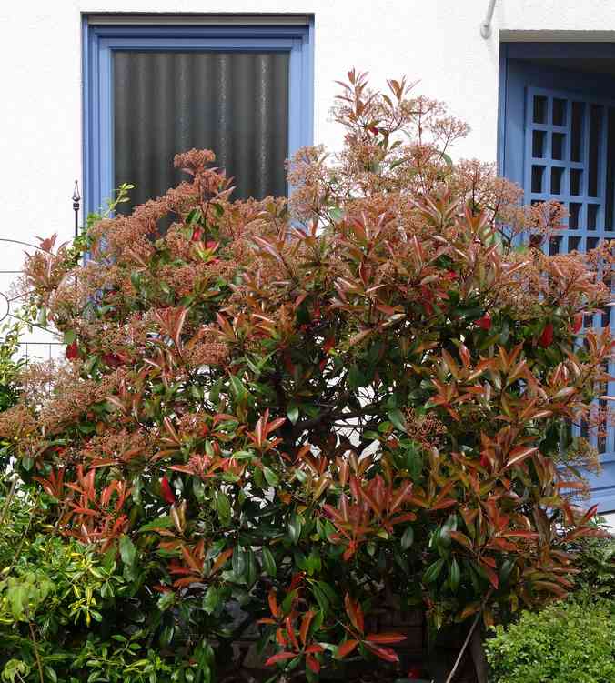 Hier 'Red Robin' zum Blühbeginn. Ich habe sie gerodet, weil die Blüten für meine Nase nach Katzenpi stinken. Das mochte ich nicht neben der Haustür haben... >:( ;D