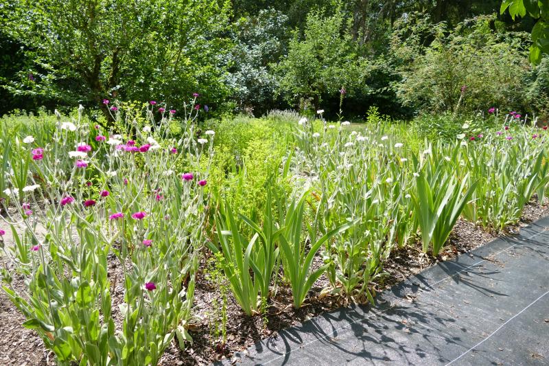Man sieht natürlich gar keine Details ::). Der Lavedel intermedia rechts des Weges kommt aus unerfindlichen Gründen gar nicht mit Blüten rüber. Dafür habe ich dieses Jahr alle erledigten Blütenstände, vor allem bei den Iris, abgeschnitten. Das macht richtig einen ordentlichen Eindruck. Ein kleiner Einblick nach rechts in das Irisbeet nach der Irisblüte: