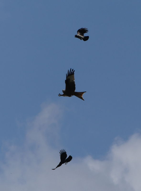 Ich schrieb das heute schon an anderer Stelle: Während der Gartenarbeit durfte ich spannende Luftkämpfe beobachten. Rings um den Garten nisten Raben und Milane. Etwa über uns muss die Grenze der Territorien verlaufen. Die Raben reagieren äußerst ungehalten, wenn der Milan das missachtet und sind damit auch erfolgreich - und erstaunlich ausdauernd. Ein paar Schnappschüsse davon sind mir heute mehr oder weniger gut gelungen.