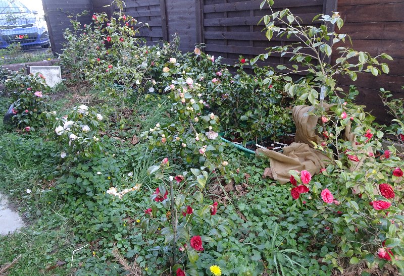 Hier sind ausgepflanzt; Alba plena, Ack scent, Shiragiku, Bokuhan, Kingjo tsubaki, Hatsu warai, Magret Davis, Hagoromo, Burgundy gem, Black Lace und noch 3 Stück nicht auf dem Bild.