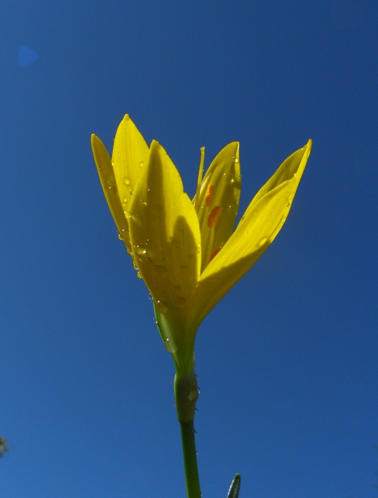 Ein weiteres Bild der Sternbergia vor strahlend blauem Himmel. Man sieht unterhalb der Blüte deutlich den unterständigen Fruchtknoten, dessen Position typisch für ein Mitglied der Amaryllidaceae ist - er ist also kein Irisgewächs wie Crocus, wie es der deutsche Name "Goldkrokus" vielleicht suggeriert.