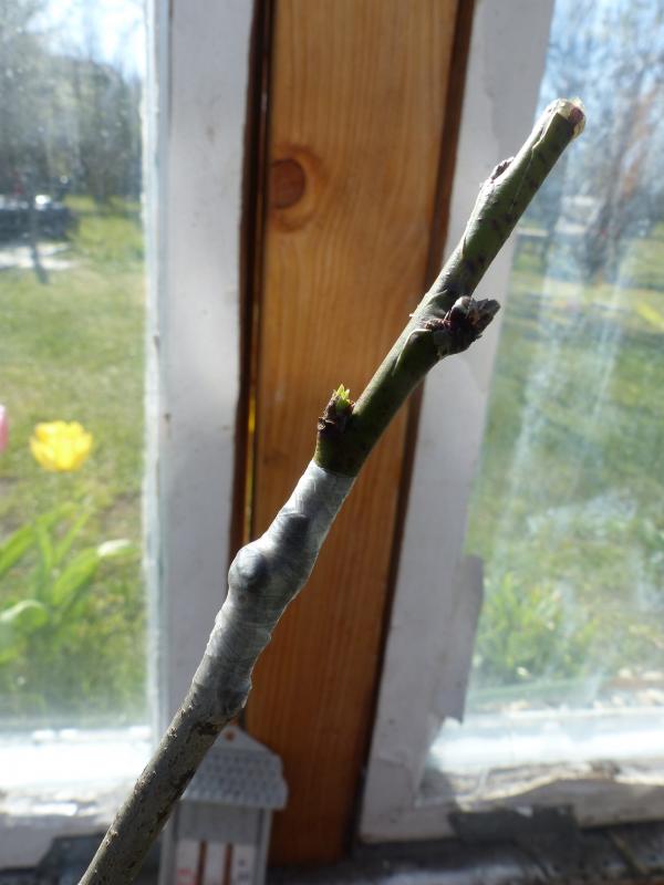 Äpfel gehen weit besser als Sommerveredelung. Hier eine Veredelung von älterem Holz, gemacht wieder mitten im Sommer. Drei Veredelungen gemacht, davon treiben zwei dieses Frühjahr aus. Unbekannte Sorte, aus Pietätsgründen veredelt.