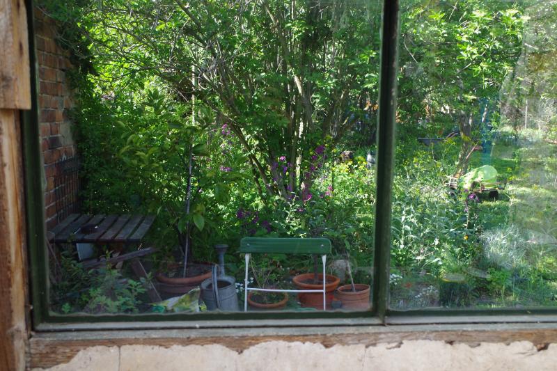 vom Pflanztisch im Gewächshaus zum Fenster hinaus.