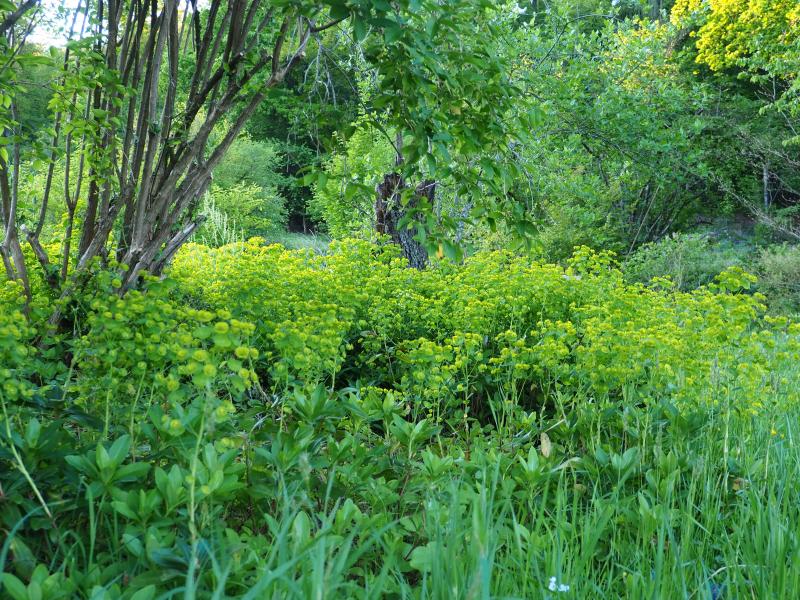 die 10 bis 15 Quadratmeter Euphorbia robbiae habe ich nicht vollständig aufs Bild bekommen. Sie wächst um einen alten Bauernjasmin, den ich diesen Winter aufgeastet habe, und da ist noch ein Totholzrest des Apfelbaumes, der vorletztes Jahr endgültig zusammengefallen ist. Die Wolfsmilch wächst kontinuierlich in die Wiese hinein. Auch das Mähen vernichtet die Ausbüxser nicht, sondern hält sie nur klein.