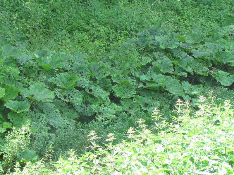 Wobei mir Krokosmians Benennung lieber gewesen ist. :D Ich hab mal einen Ausschnitt des Bestandes dieser Pestwurz vergrößert. Er wird von blühendem Giersch durchwuchert.