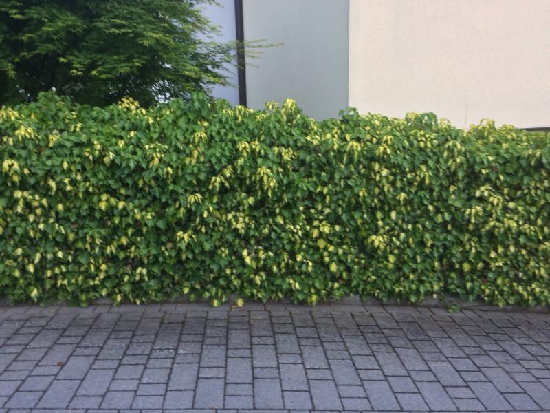 In der Nachbarschaft gibt es einen Lattenzaun, mit panaschiertem Efeu bewachsen. Blickdicht ist er.