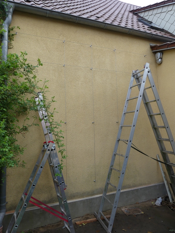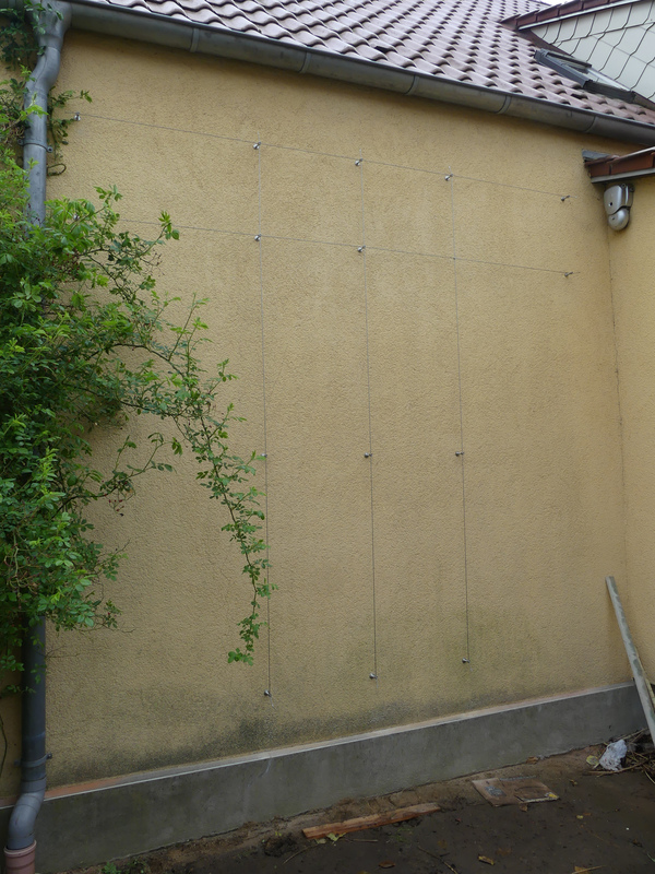 Ich wollte heute eigentlich die Dahlien verbuddeln. Dann sah ich aber, dass Actinidia tetramera var. maloides schon ordentlich zu treiben beginnt. Ein Jahr steht sie hier nun schon im Topf. Die Anbringung des Seilsystems an der Fassade hatte sich wegen Arbeiten am Fundament verschoben und war dann letztes Jahr ganz ausgefallen. ::) So habe ich mich dann heute daran gemacht. Am meisten Zeit ging für das Ausmessen und Anzeichnen sowie das Flüchten vor den häufigen Regenschauern drauf. Dann musste ich nur noch gegen meine Höhenangst ankämpfen. :-X