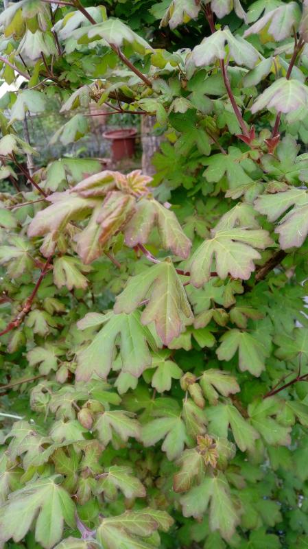 Das Frühjahrs Laub meines gewöhnlichen Feldahorns zeigt durch den roten Rand immerhin ein wenig Zier