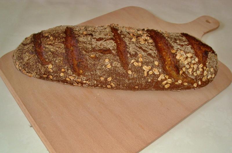 Derzeit backe ich allerdings ausschließlich mit Backferment. Sauerteig ist nicht so beliebt bei mir, Backfermentgrundansatz ist zwar auch eine Art Sauerteig, aber ganz mild und man braucht nur einen Kl davon. Mein derzeitiges Brot ist ein 5-Korn-Vollkornbrot aus selbstgemahlenem Schrot (Weizen, Roggen, Gerste, Hafer, Emmer).