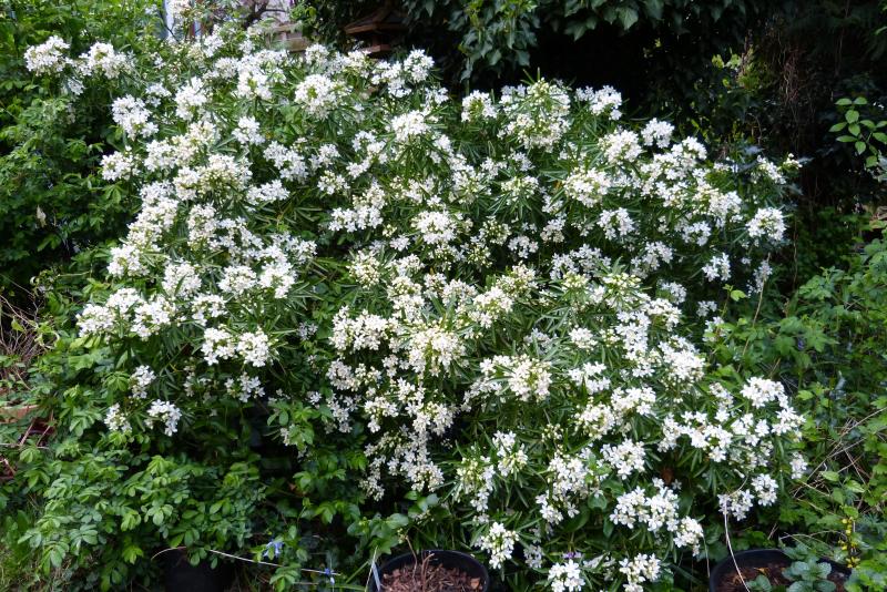 Da meine Pflanzen aber ganz sicher noch viel darben müssen dieses Jahr, kann einmal gutes Futter nicht schaden. Choisya 'White Dazzler' blüht gerade und so ein Baumarkt "Sundance" Mickerling, der mittlerweile ganz schön ist, hat auch ein paar Blüten. Die anderen Pflanzen verhalten sich eher zurückhaltend, sind noch nicht lange genug hier...