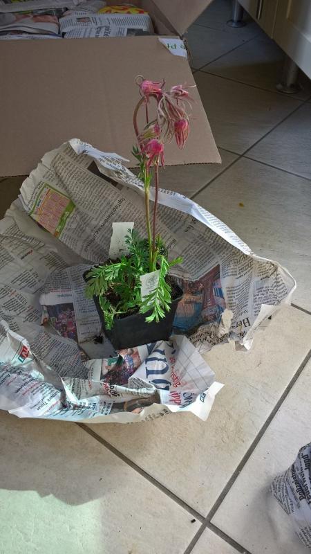 Verpackt war in einen Karton mit ordentlich Zeitung, die Erde extra im Topf gesichert, eine der Pflanzen war noch extra mit Stäben gesichert.