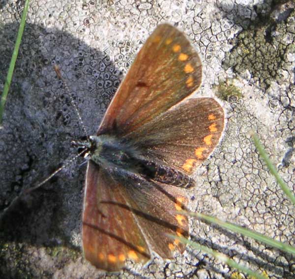 Kleiner Feuerfalter Lycaena phlaeas L.1,5 cm lange Vorderflügel. Dunkler Saum mit schwarzen, unregelmäßig verteilten Punkten, die auf der helleren Unterseite der Vorderflügel weiß umrandet sind. War ziemlich unruhig, der kleine Flattermann.