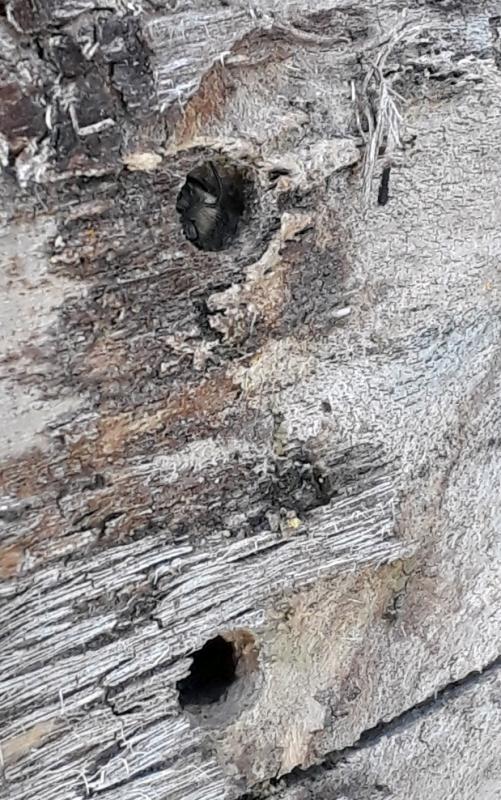 Ich habe mal eine Identifikationsfrage an die Experten. Leider habe ich das Tierchen nur von seiner hübschen Kehrseite fotografieren können. In einer atemberaubenden Geschwindigkeit (sie hat gerade mal 1 Stunde gebraucht um komplett im Holz zu verschwinden :o) hat sie ein Loch in meinen Holzklotz neben der Nisthilfe gebohrt. Dabei konnte ich sie leider nie von vorn sehen. Das Loch ist mit max. 3mm Durchmesser winzig. Genau wie seine Erbauerin (wenn es hoch kommt vielleicht 6-7mm?). Die Flügel scheinen gräulich zu sein und der Hinterleib ist haarlos und blauschwarz schimmernd. Eine Zeichnung an dem Beinen konnte ich auch nicht sehen. Einfach nur schwarz. Kann man anhand dieser Popofotos etwas sagen?