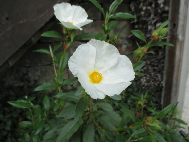 Hier noch ein Bild von Cistus laurifolius atlanticus, leider ist die Blechhütte dahinter etwas störend aber aus dieser Perspektive hebt sich die Pflanze besser vom Hintergrund ab. Ist inzwischen sicher fast 1,5 Meter breit, C. x florentinus war schon fast darunter.