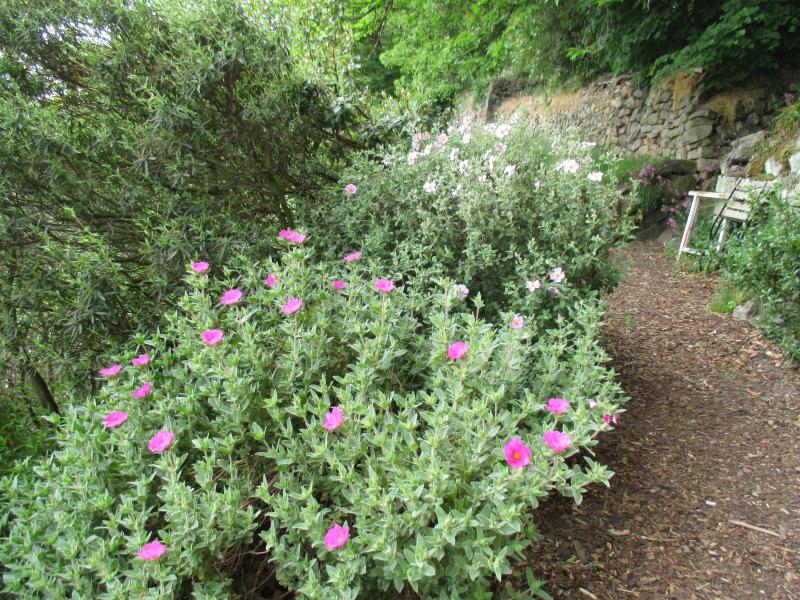 Etwas näher, es sind zu sehen, 'Grayswood Pink', Cistus salviifolius und Cistus creticus