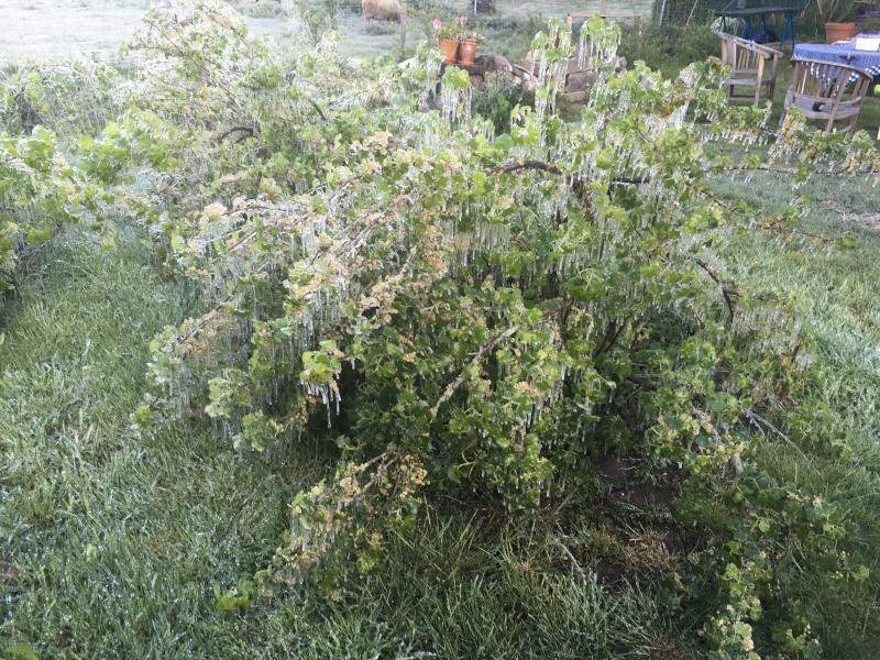 Hier waren es -4 Grad heute Morgen, ob die Johannisbeeren das ausgehalten haben, ich habe es mal mit bBeregnung versucht. So sahen sie heute morgen aus- total eingefroren :-\