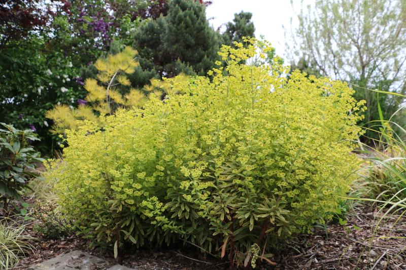 Ich habe zwei älter Euphorbia palustris im Garten, die sich in den vergangenen Jahren schon recht unterschiedlich gezeigt haben. Dieses Exemplar wächst straff aufrecht, ist momentan knapp 60 cm hoch und hat recht kleine Blütenstände.