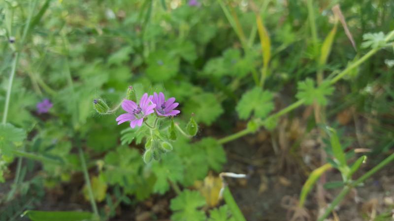 Ein paar Schritte weiter : der kleine Storchenschnabel, bevorzugt den gleichen trockenen und sandigen Standort wie der Gewöhnliche Reiher-