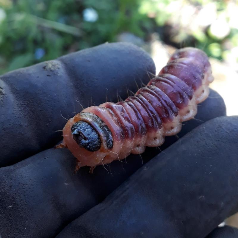 Als ich dieser Tage den Frostschutz von den Erdbeeren entfernte, habe ich ein Exemplar bei der Fertigstellung seiner Puppenstupe gestört :-\. Zwischen dem Vlies und einem beschwerenden Balken wollte er es sich gemütlich machen :P