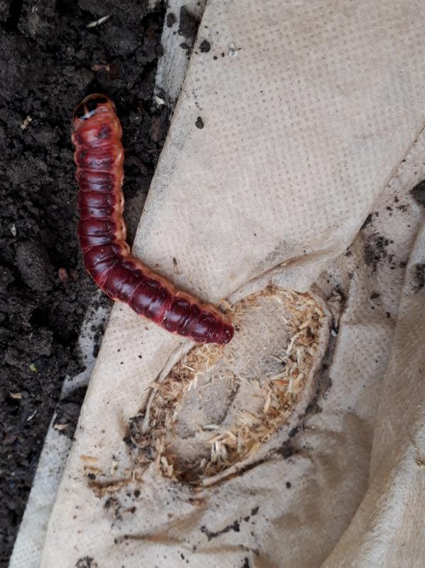 Es ist fie Raupe des Weidenbohrers, eines Nachtfalters.