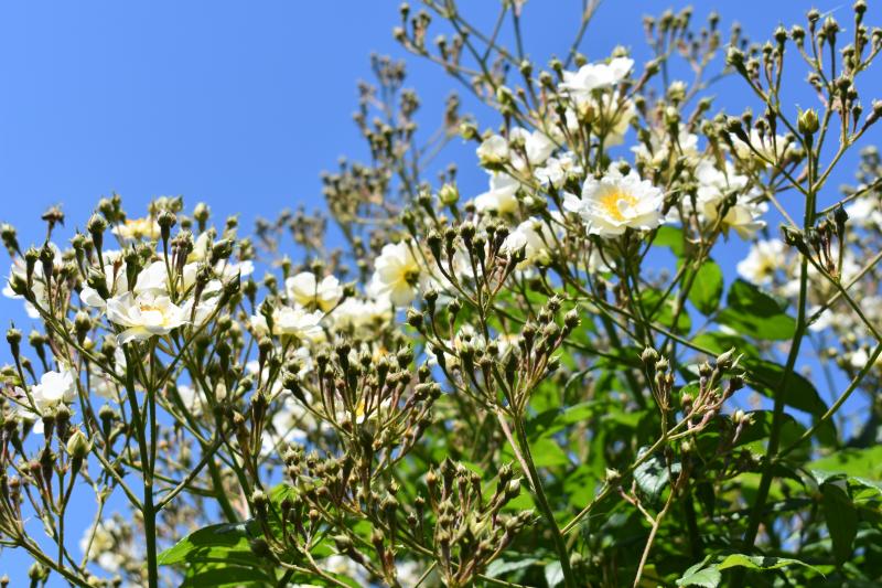 Die Inermis Morlettii wird von Jahr zu Jahr schöner! Weil ich sie letztes Jahr (leider) nicht geschnitten habe, breitet sie sich malerisch über den Wäscheplatz und die Himbeeren aus: