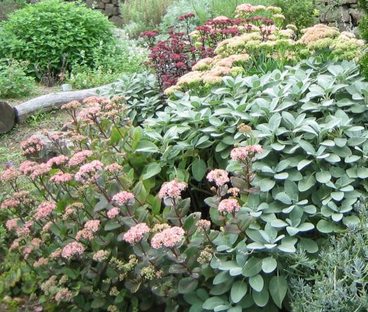 Das weiße Sedum könnte Stardust sein, wenn das Laub grüner wäre.Hier sind im Vordergrund 'Matrona' dahinter 'Herbstfreude' und 'Mohrchen' zu sehen.