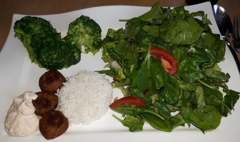 Heute hab es Brokkoli, Basmati, Klößchen mit Chiliquark und Salat aus Salatherzen, Garten-Babyspinat und Tomaten