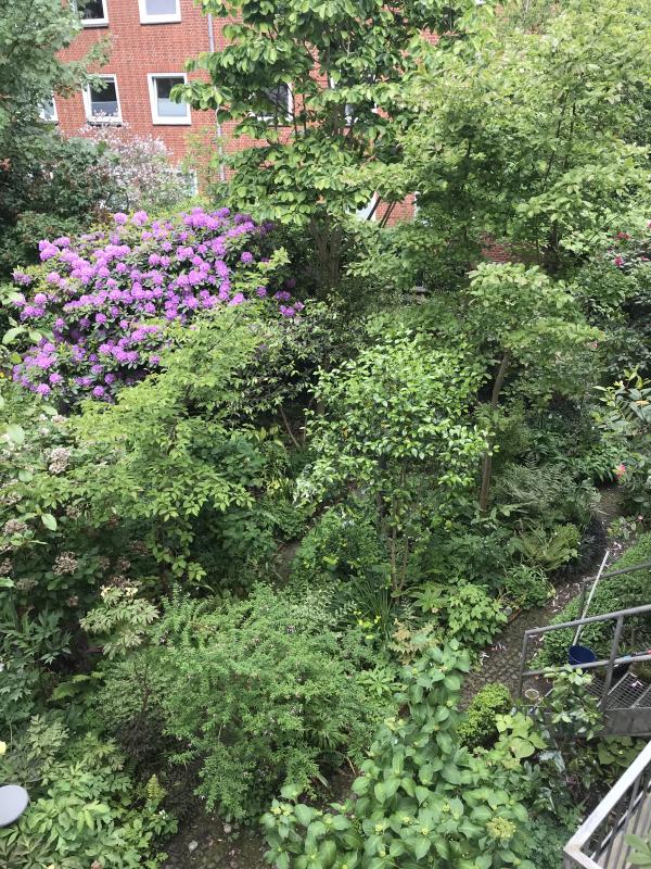 Von oben betrachtet ist es hier üppig grün... nur die Rhododendren bringen etwas Farbe und letzte Magnoliennlüte an der 'Susan' und Magnolia sieboldii geben ihr bestes. :)