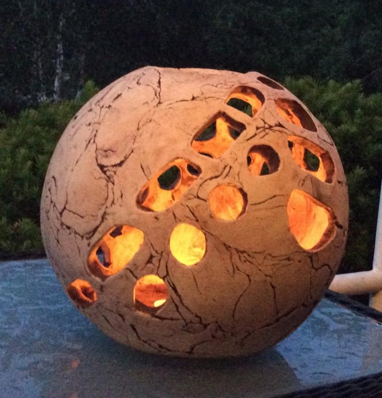Gekauft habe ich eine Lichterkette mit Solarzelle. Gedacht war, die Solarzelle oben in die Öffnung zu legen. Jetzt ist diese zu klein. Hätte der Töpferkurs stattgefunden, hätte ich die Öffnung vor dem Brennen vergrößert. Aber „Hätte, hätte, Fahrradkette“. Diese Kugel wird mit Teelichtern betrieben und ich baue im Herbst eine neue.