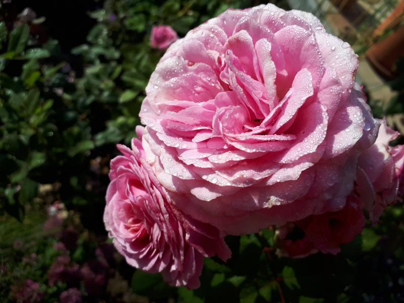 Auf dem Foto vom letzten Sommer eine, die relativ gut mitmacht: 'Rosengräfin Marie Henriette'.