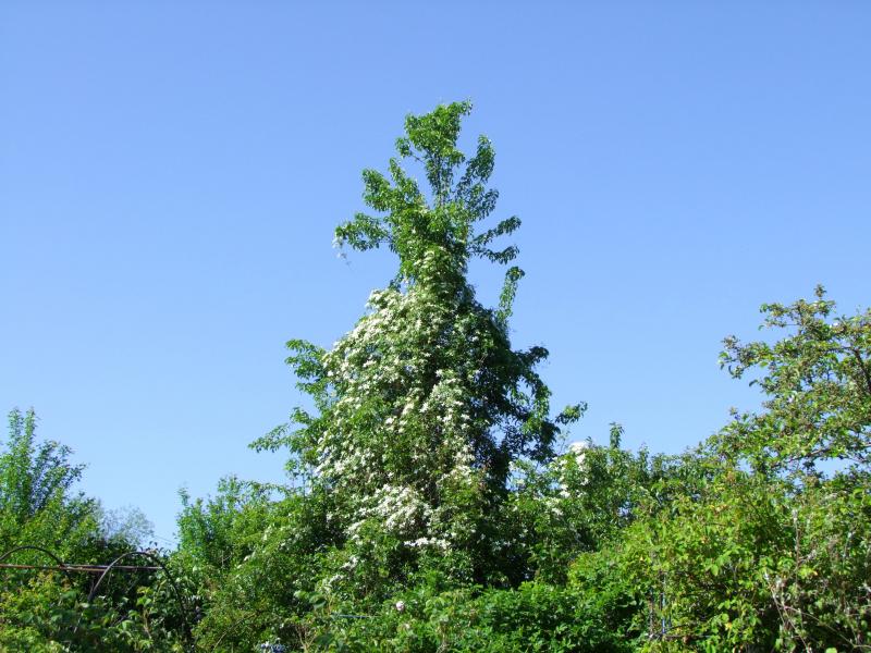 Ich weiß, dass die Montana eine enorme Wuchskraft hat und gerne noch hinaus will. Aber der Hartriegel schwächelt seit zwei Jahren doch arg, er treibt zwar zuverlässig aus, aber das Laub ist recht klein und schütter. Ich gehe davon aus, dass er ohnehin nicht mehr so fit ist, da hatte ich überlegt, ob ich ihn als "Opferbaum" verwenden könnte. Der Hartriegel (ein wilder Cornus sanguinea) ist sehr groß (locker 5 oder 6 Meter hoch), so würde er einen zweiten Frühling erleben. Aber gut, es ist bisher nur eine Idee, ich könnte sie z. B. auch in die große Tanne (20 m hoch) und über das Dach vom Gartenhaus wachsen. Wäre zur Blütezeit auf jeden Fall ein toller Hingucker.