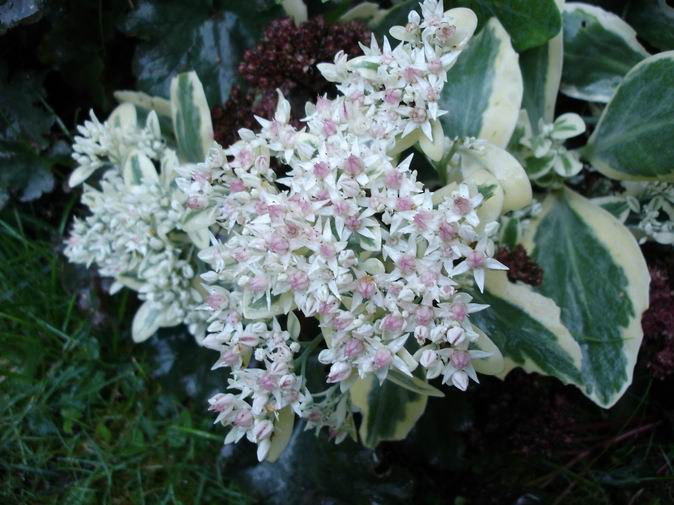 In meinem aufgrund sommerlicher Vernachlässigung durch ineinander und übereinandergefallene Stauden vermurksten Garten gibt es doch immer wieder mal Lichtblicke:hier beginnt das hübsche Sedum "Frosty Morn" zu blühen, dessen Blütchen mich irgendwie immer an ein amerikanisches Jungmädchenzimmer erinnern. Es gibt dabei jedes Jahr auch nicht panaschierte, meist sehr kräftige Stiele, die aber stehenbleiben dürfen, da sie nicht diese leidige Umfalltendenz haben und dadurch ja über den lagernden Trieben der Weiß-Grünen stehen.