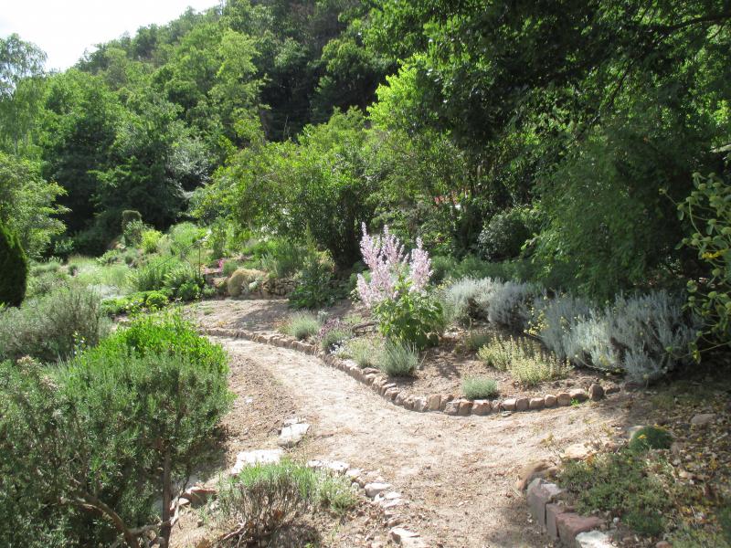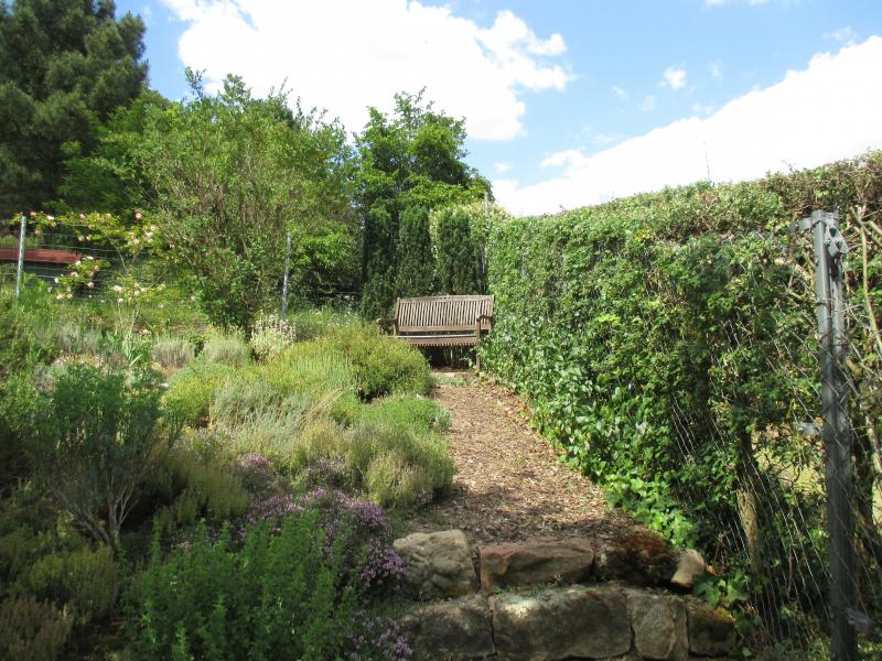 Setzt man sich auf die Bank hat man diesen Blick in den Garten hinauf.