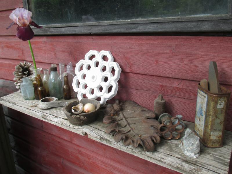 Das Fensterbrett vom Geräteschuppen mit einem Sammelsurium von Geschenken, Ausgrabungen und sonstigen Fundstücken.