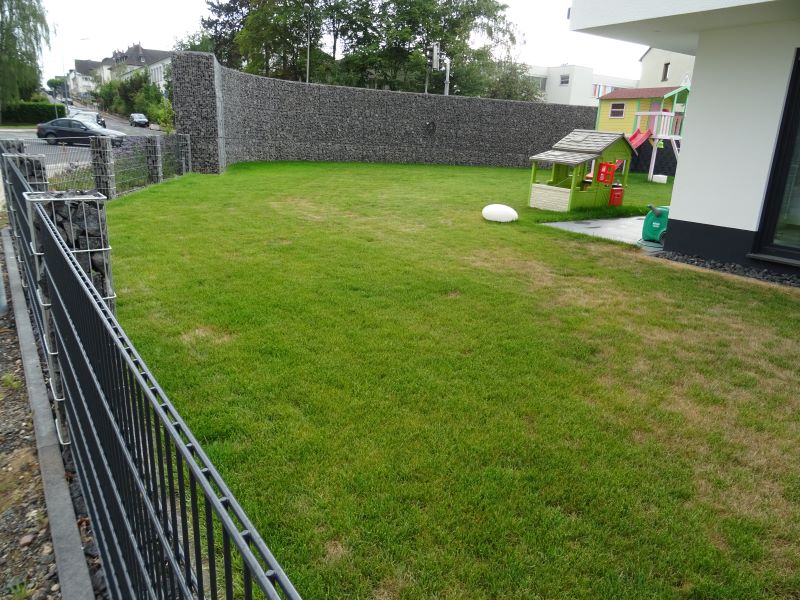 Die Gabionenwand als Lärmschutz gegen die verkehrsreiche Hauptstraße (?) mit Ampel ist ja gar nicht so schlecht, aber es wäre doch reichlich Platz für eine schöne freiwachsende Hecke aus Blütensträuchern vor dieser "Burgmauer" gewesen...