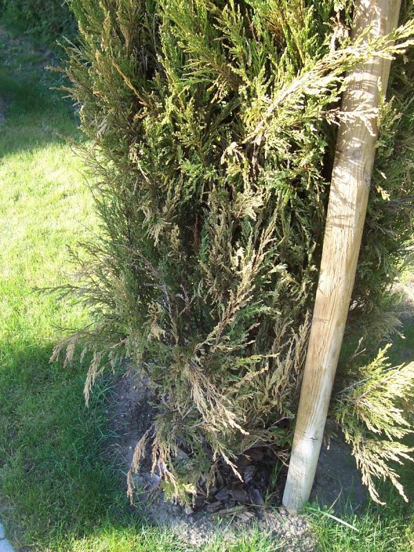 Schnupper mal dran! Manchmal sind Kater, Fuchs oder Marderartige die Ursache eines solchen Bildes. Das riecht man. Wird in der Folge dann braun und nadelt ab.