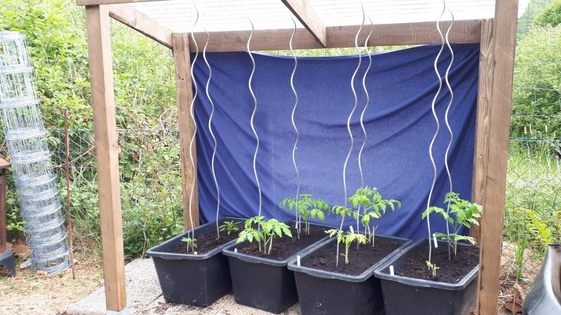 Außerdem könnten wir ein Betttuch vor das Tomatenhaus spannen, so kommt nicht so viel Sonne rein. Das haben wir an den ersten Tagen wegen kalter Nächte auch gemacht.