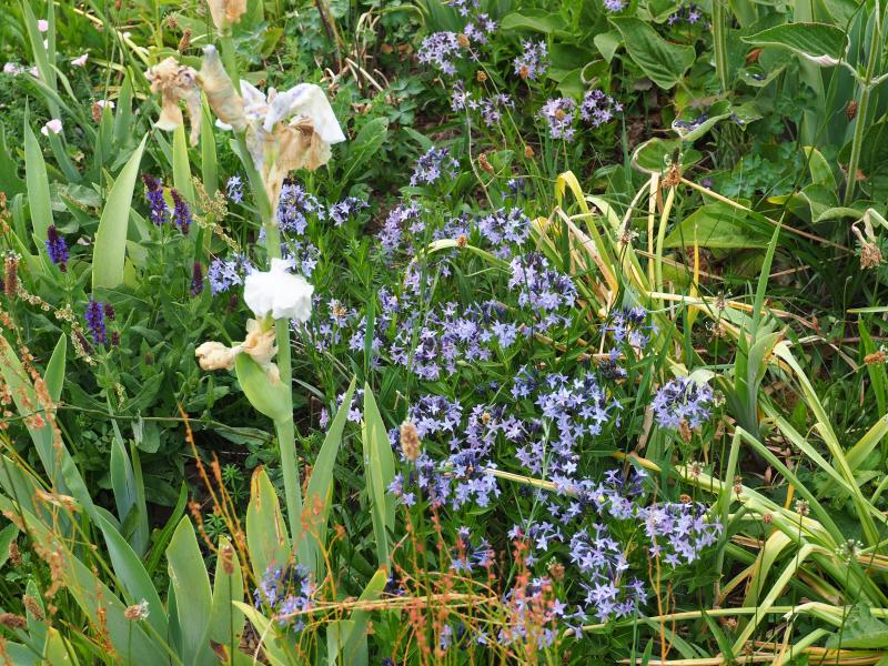 am 22. Mai blühte Rhazya orientalis Syn. Amsonia orientalis. Zuerst sind die Blüten lila, richtig lila, später werden sie reinblau und sind größer als die von Amsonia tabernaemontana var. salicifolia.