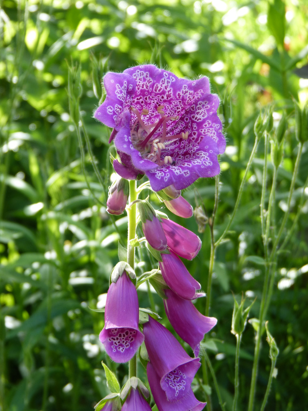 Pelorienblütige Fingerhüte waren wohl schon vor unserem Hauskauf vor 36 Jahren im Garten, und seither tauchen jedes Jahr wieder einzelne auf. Interessanterweise tragen die Seitentriebe keine Pelorien an der Spitze, sondern röhrenförmig umgebildete Blüten, die jedoch wie die Pelorien auch vor den Knospen darunter aufblühen.
